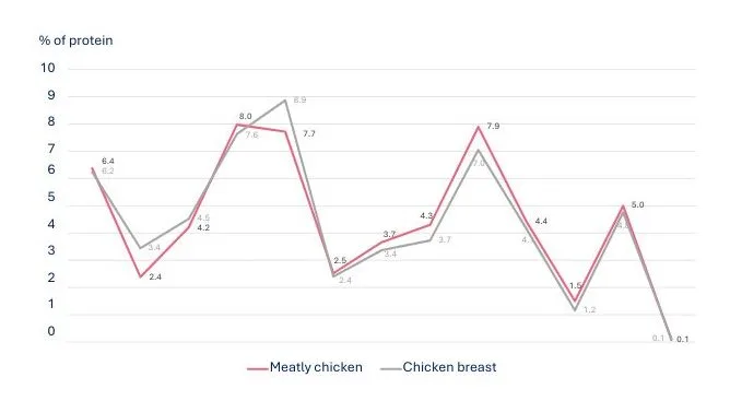 Above: Amino Acid Profiles of Meatly Chicken Compared with Chicken Breast.